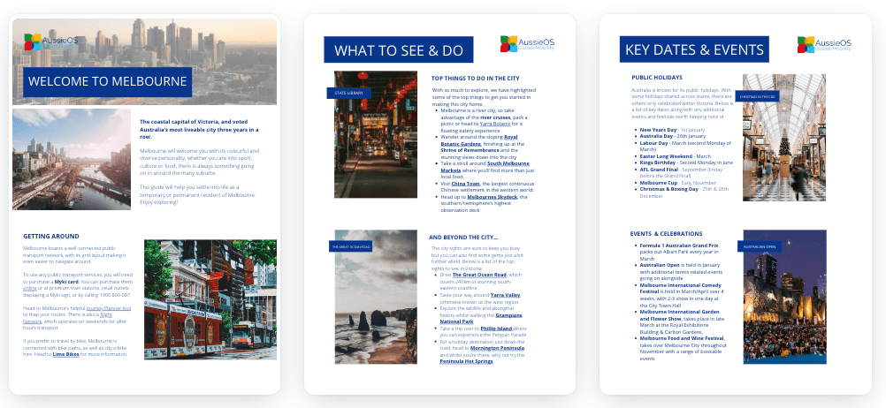 Aussie OS is a premium relocation service throughout Australia. The was brief was to create user friendly handbooks for each of the major cities within Australia. These would become the clients location bible as they began the process of calling Australia home. The guides needed to me informative but visually appealing. I was given a blank canvas and ask to provide my own take on the specifics needed for each city as a new resident. My response was to choose a specific type of photography that showcased a more local view into the highlights of the cities. Whilst touching on well know areas, I also choose to provide more ‘off the beaten track’ recommendations – giving a slightly more personalised touch to the guides.